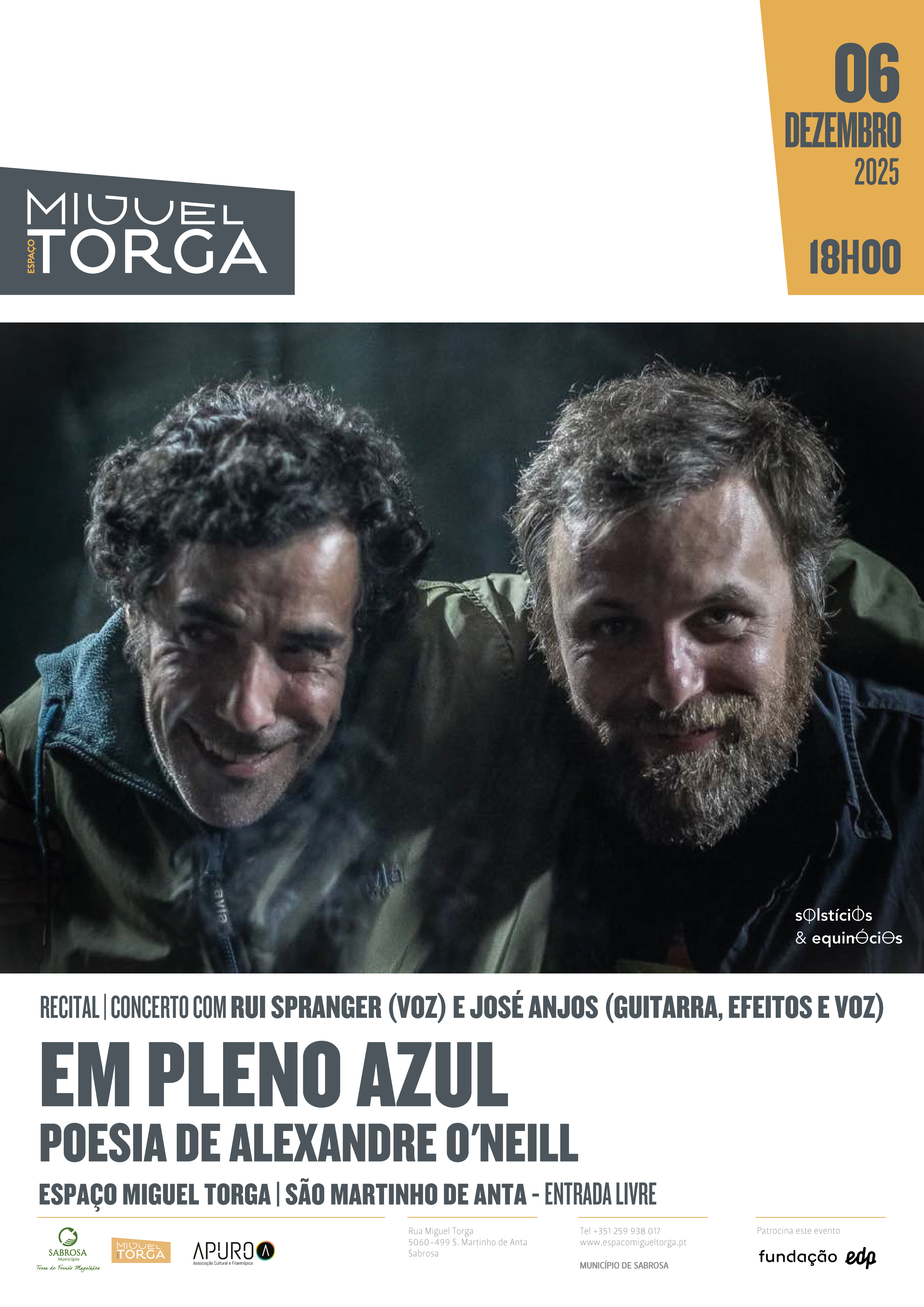 06 dezembro | 18h00 | Solstícios e Equinócios | Recital/concerto "Em Pleno Azul - Poesia de Alexandre O'Neill" | Rui Spranger e José Anjos | Espaço Miguel Torga