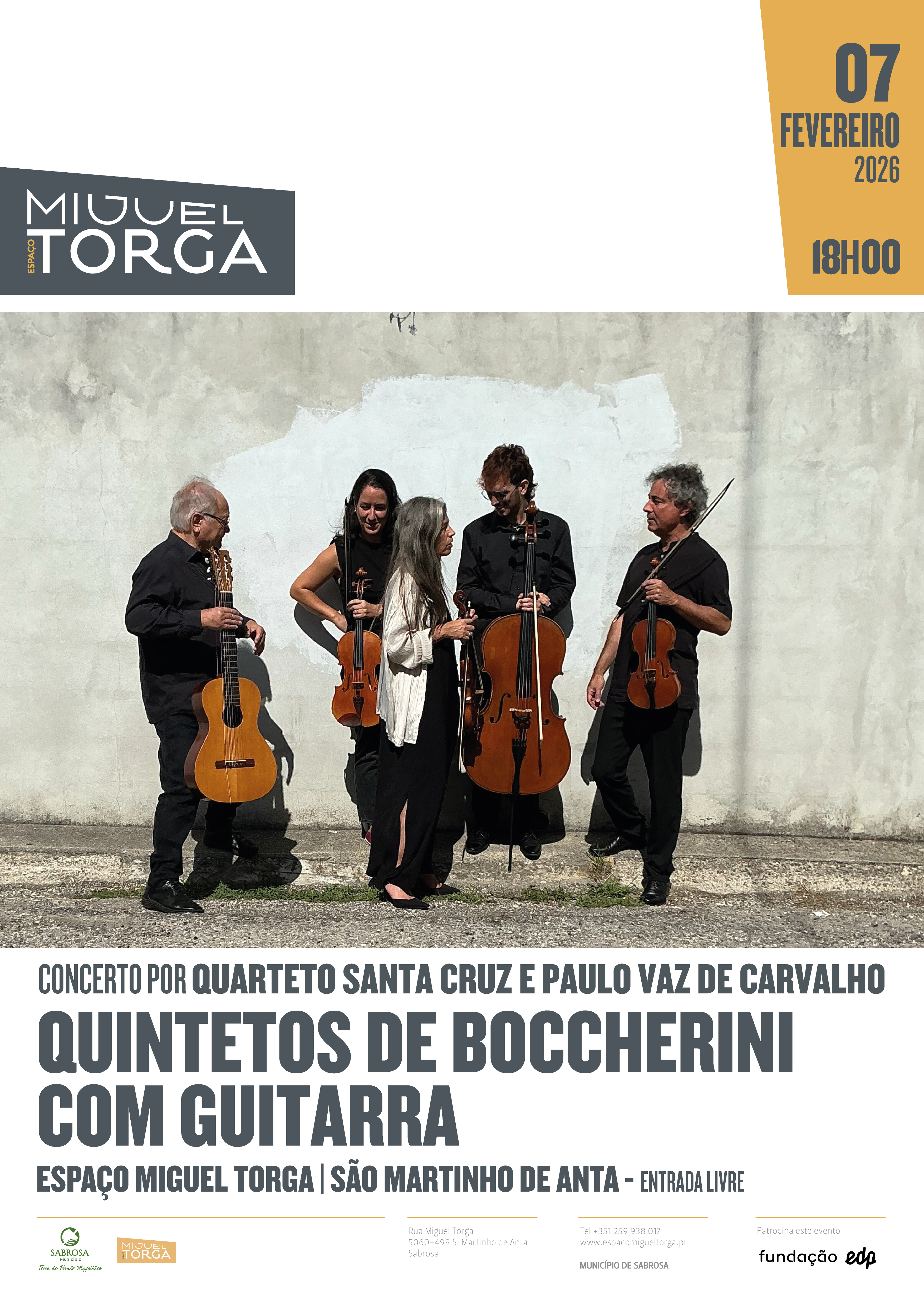 07 fevereiro | 18H00 | Concerto "Quintetos de Boccherini com Guitarra" | Quarteto de Santa Cruz e Paulo Vaz de Carvalho | Espaço Miguel Torga